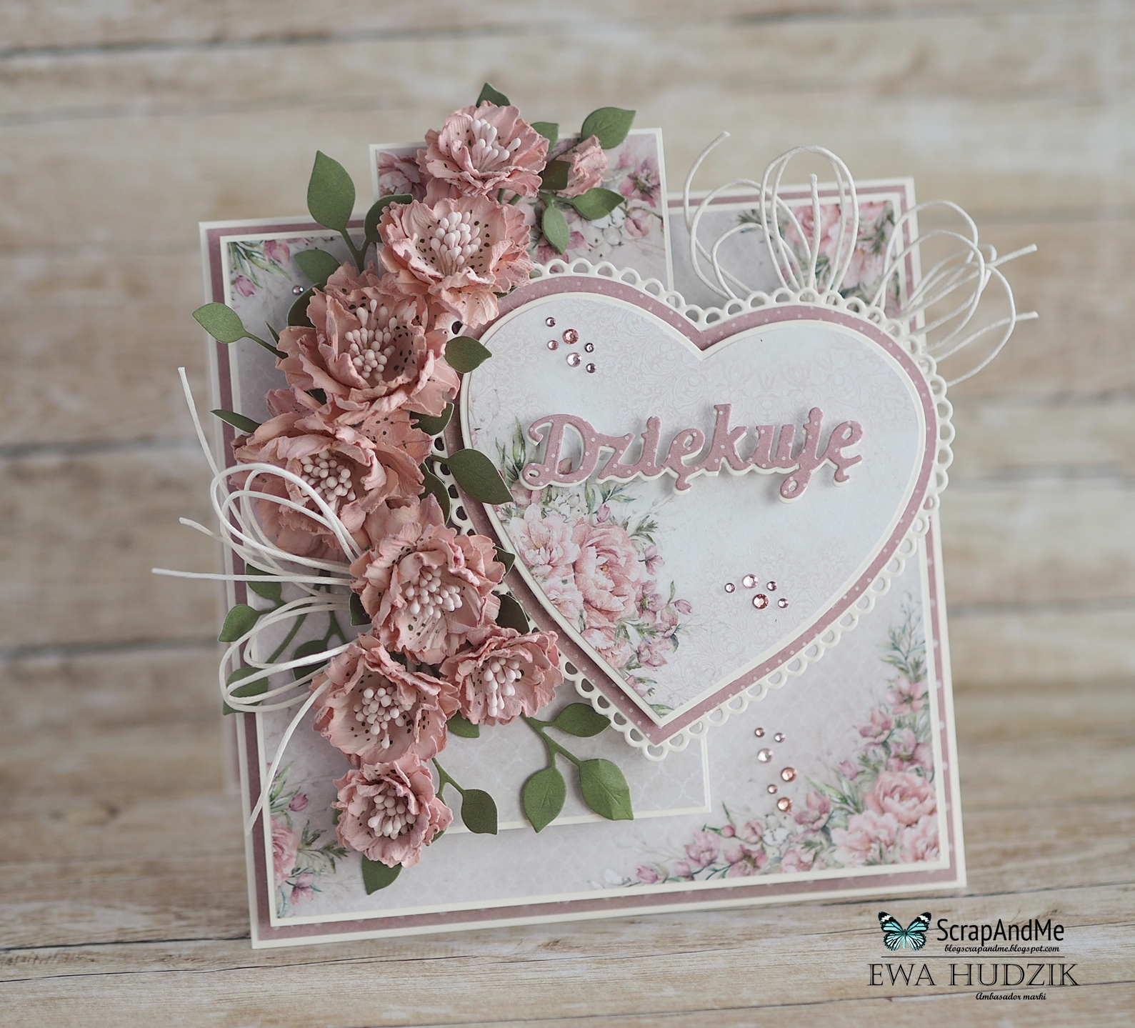 Kartka urodzinowa z przepięknej kolekcji papierów ScrapAndMe. Do tych papierów powstały specjalnie 3 rodzaje kwiatów.